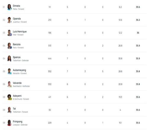 39.6kmh,帕福斯前锋迪马塔断层领先欧冠冲刺速度排行榜