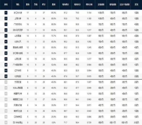 由于广厦男篮、广东男篮和上海男篮都在这轮比赛中战胜了各自对手,前三名的排列并没有任何变化,依旧是广厦男篮排名榜首,上海男篮和广东男篮分列第二位和第三位。深圳男篮最近的势头非常凶,已经取得了一波五连胜,取代了原本排名第四的青岛男篮。不过从战绩来看的话,深圳男篮和前面三支球队的差距还是有些明显的。